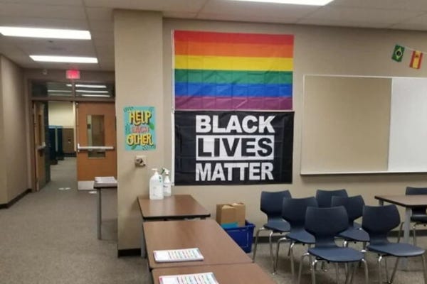Just a few doors down from me is your typical activist posing as an educator. Let’s call her Teacher X. You know the type. She leans left, and I use leans like a skydiver hurling toward the earth leans out the plane door. Behind her desk is a Women’s March poster, a pink triangle taped to the whiteboard, and pronouns written next to her name. A Black Lives Matter flag and a rainbow flag are proudly displayed. Her shelves are lined with…