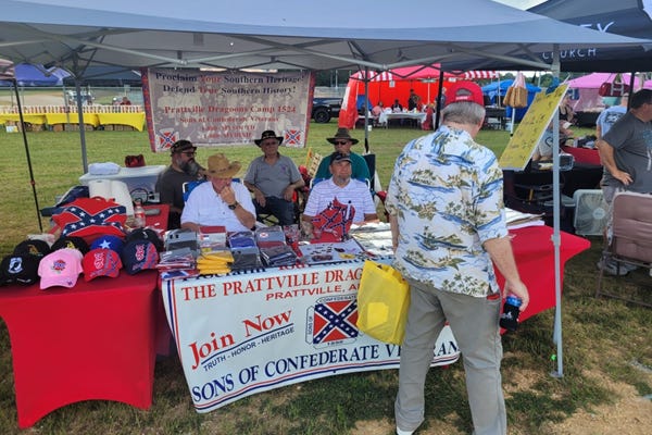 Nonetheless the Dragoons of SCV Camp 1524 setup their booth that moring and manned it throughout the day til after 3pm. Dragoons present included Quartermaster Myrick who brought the canopy and all the camp stores and stayed the entire day, Brigade Commander Waldo, Treasurer Dennis (who also stayed all day), Color Sgt Leverette, Adjutant Butler and compatriot Schwartz. A few items out of the camp stores including 3x5ft flags and ballcaps and Confederate shot glasses were sold and a number of mini-Battle flags and SCV Alabama Division education posters were handed out to passers-by.