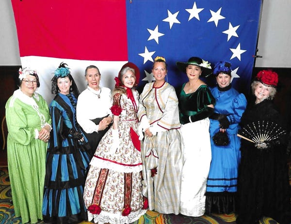 The lovely Belles of the Rebel Joan Of Arc Chapter 2721, The Woodlands Texas, of the United Daughters of the Confederacy, beg your pardon for the picture being displayed in reverse, and our beautiful First National Flag being shown in reverse! A Technical Error! Still the Ladies of the Rebel Joan Of Arc Chapter attended Texas Division Convention in Grand Style in their beautiful “Period Dresses”, honoring their Ancestors. Tea Dresses, Day Dresses, Dinner/Evening Dresses, Town Dresses, and the always acceptable black attire were on full display that evening. Many of the Dresses were designed by their owners, and their Chapeau’s and Reticules were made to match! Heirloom antique Jewelry from their families for andornment, and probably the totally period correct under garments for a proper dignified lady of the South!