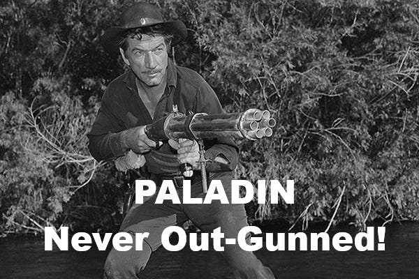 Paladin open carried his custom-made, first-generation Colt Single Action Army in .45 Colt caliber with a 7.5-inch barrel. He also carried concealed a two-shot Remington derringer as a backup weapon. In a high threat environment, a backup is a pretty good idea.