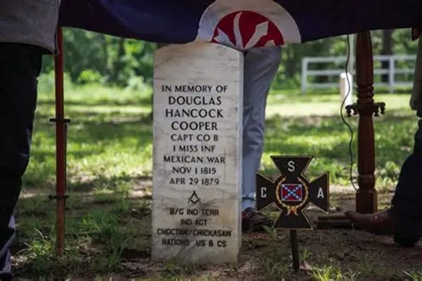 A headstone dedication was held Saturday for Confederate Brigadier General Douglas Hancock Cooper at the Fort Washita Confederate Cemetery. The event was organized by Clem Vann Rogers, Camp 481 Sons of Confederate Veterans Oklahoma City.