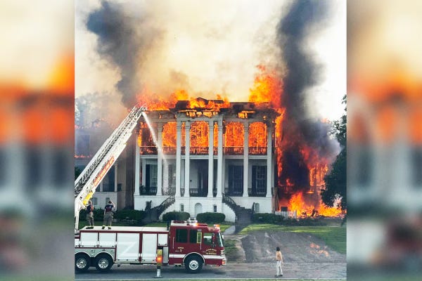 In a scene reminiscent of the Margaret Mitchell home arson before the Atlanta Olympics, historic Nottaway has burned to the ground. And just like the Mitchell fire, haters and anti-Southern bigots are calling for all ante-bellum homes to burn. Could this be just a short circuit in old wiring or yet another example of leftist hate? - DD