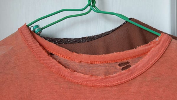 The suffering victim, a faded red Fruit of the Loom t-shirt purchased from Walmart 13 years ago, was reportedly still being worn 3-4 times per week despite the man's wife's repeated requests to throw the shirt away.
