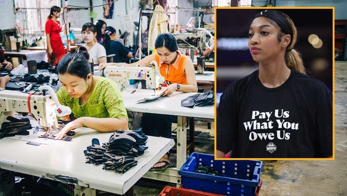 Ahead of warm-ups for the 2025 WNBA All-Star Game, Uyghur slaves were seen dutifully sewing the words "Pay Us What You Owe Us" onto hundreds of shirts.