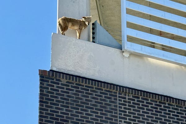 A witness attempted to chase the coyote away from the scene, but the canine instead fled to a second-story ledge outside the building.
