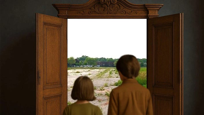 The wardrobe initially sparked excitement when the kids heard faint sounds of what sounded like adventure beyond the creaky doors. However, their dreams of meeting a mythical, regal lion or befriending fauns or beavers were dashed as they emerged next to a vape shop and a shuttered Applebee's restaurant.