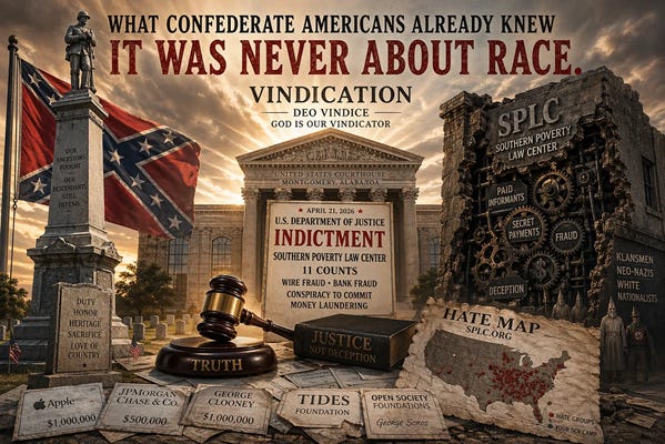 Yesterday the Department of Justice dropped an 11 count indictment on the Southern Poverty Law Center charging wire fraud, bank fraud, and conspiracy to commit money laundering.¹ The core allegation is not complicated. The SPLC was secretly paying leaders and organizers of the very hate groups it claimed to be fighting. Klansmen. Neo-Nazis. White nationalists. On the SPLC payroll.² While the SPLC was putting your SCV camp on a map next to those same groups and calling you a white nationalist.