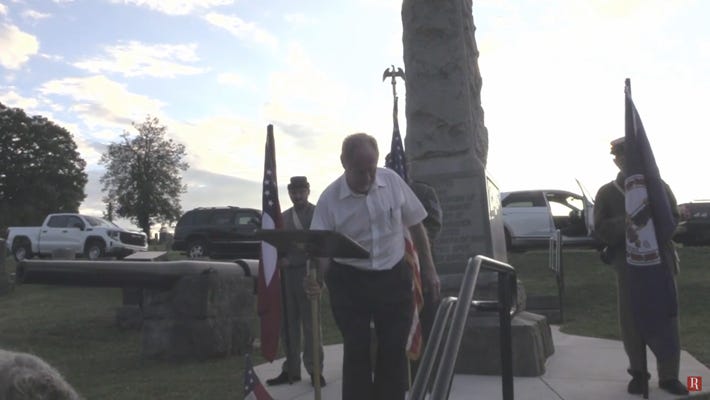 Diehl recounted the retaliatory execution ordered by Col. John S. Mosby following the hangings—an act Mosby later said he regretted having to do, but not doing his duty. Diehl then led a solemn call-and-response “roll,” asking the crowd to join after each third reading of a name: Thomas Anderson; Carter (surname only provided); David Joan; Lucian Love; Thomas Overby; Gallatin Willis; and Henry Rhodes, described as a teenage bystander shot after the chaos in town. After the final call of each name, the audience replied, “Died a Southern hero.”