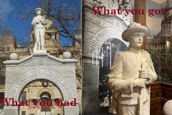 They removed their impressive memorial in June, 2020. Spent a lot of money on restoration and storage. To give them credit, they developed it into an impressive and attractive indoor museum display at the courthouse which was approved by the Texas History Commission. (Along with the obligatory white-guilt plaque explaining African slavery) After some HVAC renovation, the courthouse reopened proud of the new exhibit.