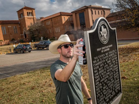 (Southern Partisan) - What started as childhood resentment for his dad’s mandatory roadside history stops on family vacations has evolved into a full-blown passion for Chris Woolsey. Woolsey is now on a heartfelt mission to breathe new life into Texas’ fading historical markers. On a mild Tuesday afternoon just before Christmas, Woolsey set up his camera and tripod near a weather-worn historical marker outside First Christian Church in Longview. Sandpaper in hand, he began transforming the sun-faded marker back to its past glory.
