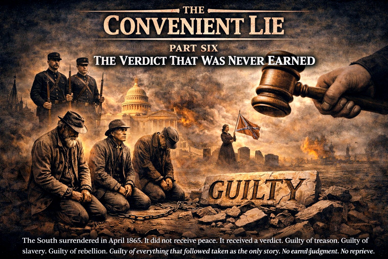 Guilty of treason. Guilty of slavery. Guilty of rebellion. Guilty of everything that followed. No trial. No hearing. No accounting for the broken compact or the thirty years of economic extraction or the constitutional argument Jefferson and Madison had established. Just a verdict. Handed down by the victors. Enforced for a hundred and sixty years.