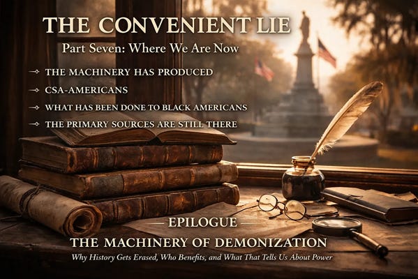 A tariff. A warning. A compact already straining under the weight of competing interests that would never be fully reconciled. Thirty-two years of broken promises and broken faith. A war that did not have to happen. A verdict that was never earned. A hundred and sixty years of a narrative designed to serve that verdict.