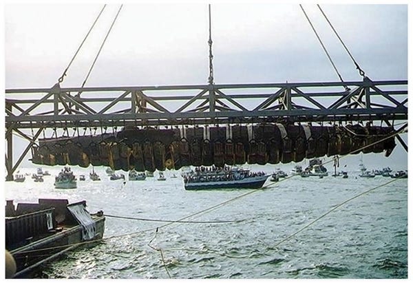 Divers raised the sunken Confederate submarine C.S.S. Horace L.Hunley from the bottom of Charleston Harbor.