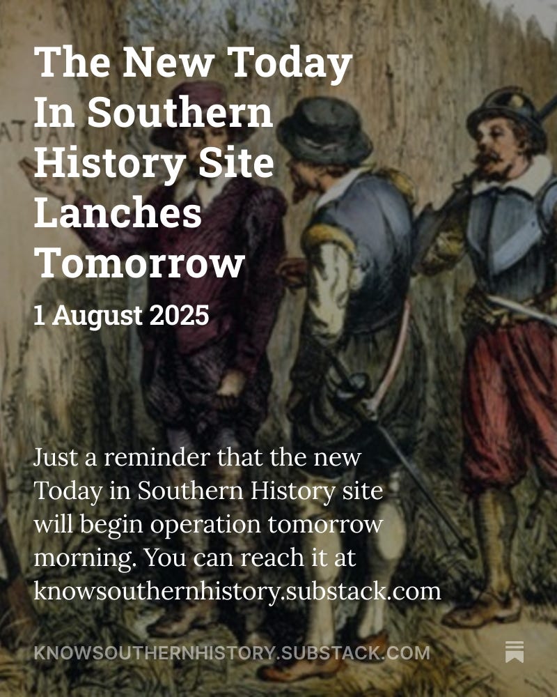 Just a reminder that the new Today in Southern History site will begin operation tomorrow morning. You can reach it at knowsouthernhistory.substack.com