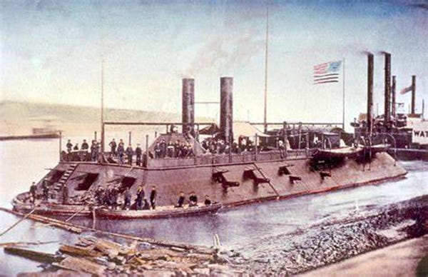 During the American Civil War, huge metal monsters roamed the Mississippi River. Called ironclads, these boats were about 50 yards long, carried 75 tons of armor on their hulls and decks, sported up to 13 guns, and had crews numbering up to 250 men.