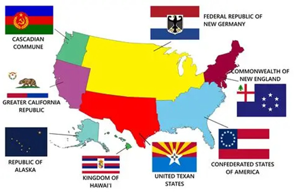 (Arthur in California) - The idea of a future break-up of America into several separate nation-states has been a popular subject explored through multiple fictional depictions in novels and cinema. Whether a result of a catastrophic war, or irreconcilable political differences, the imagined outcomes give the audience a vision of this balkanized America in the comfort of a movie theater or their favorite reading chair.